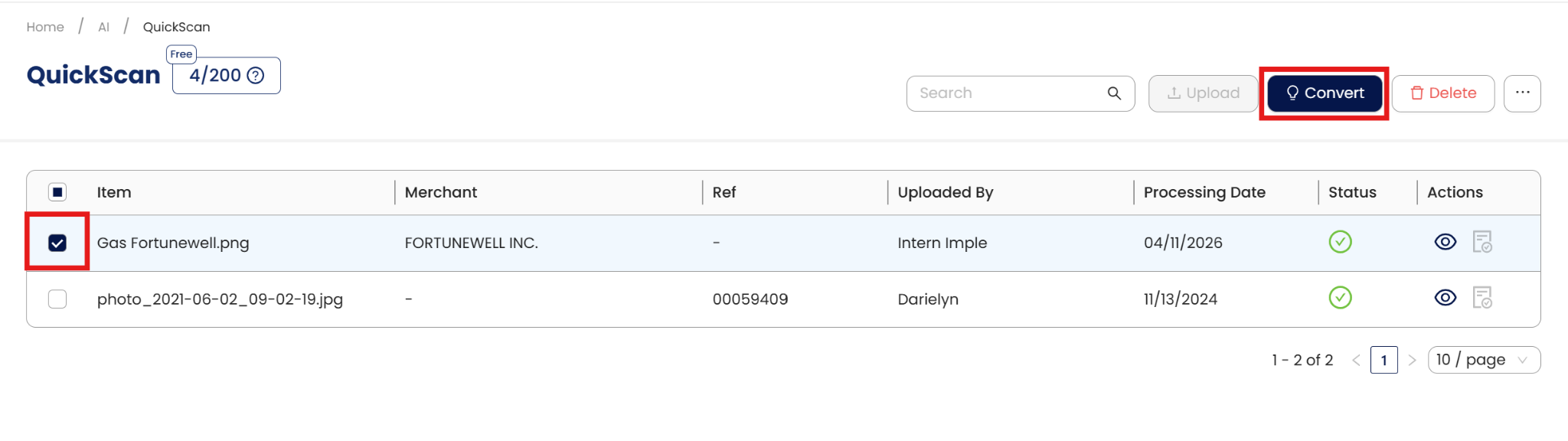 1. Click the checkbox of the transaction to convert. This will enable the Convert button, then click it.