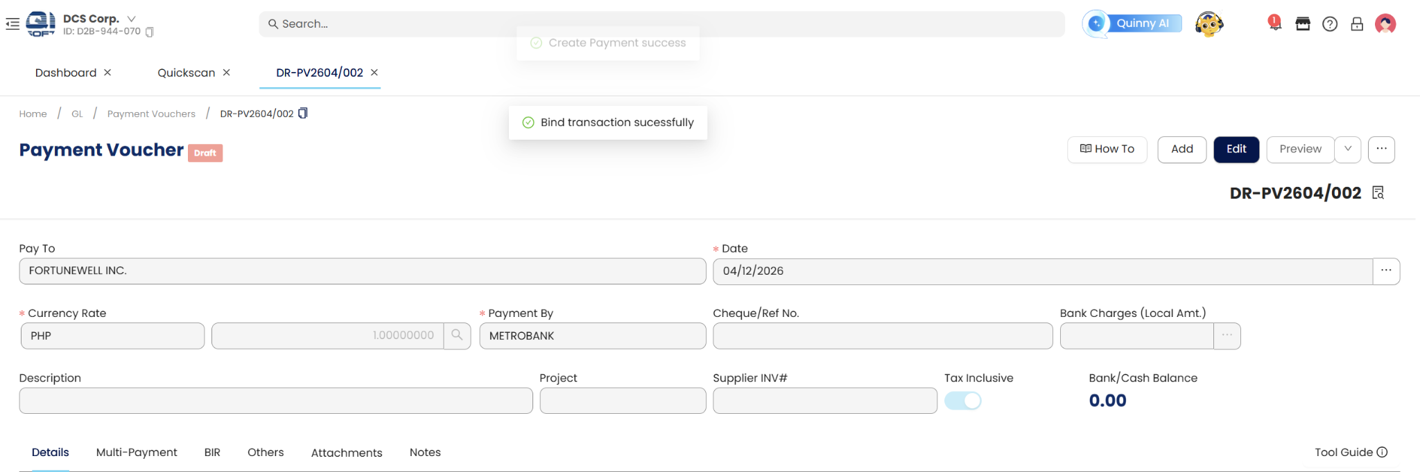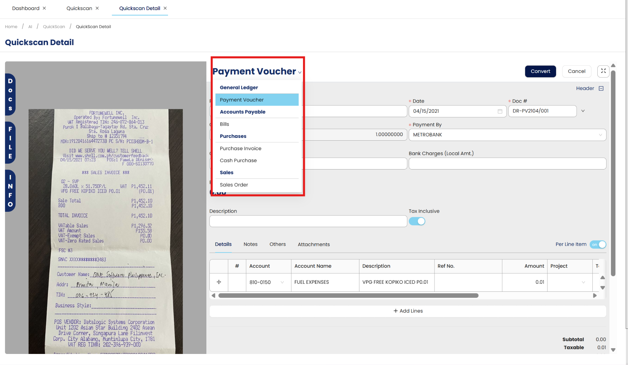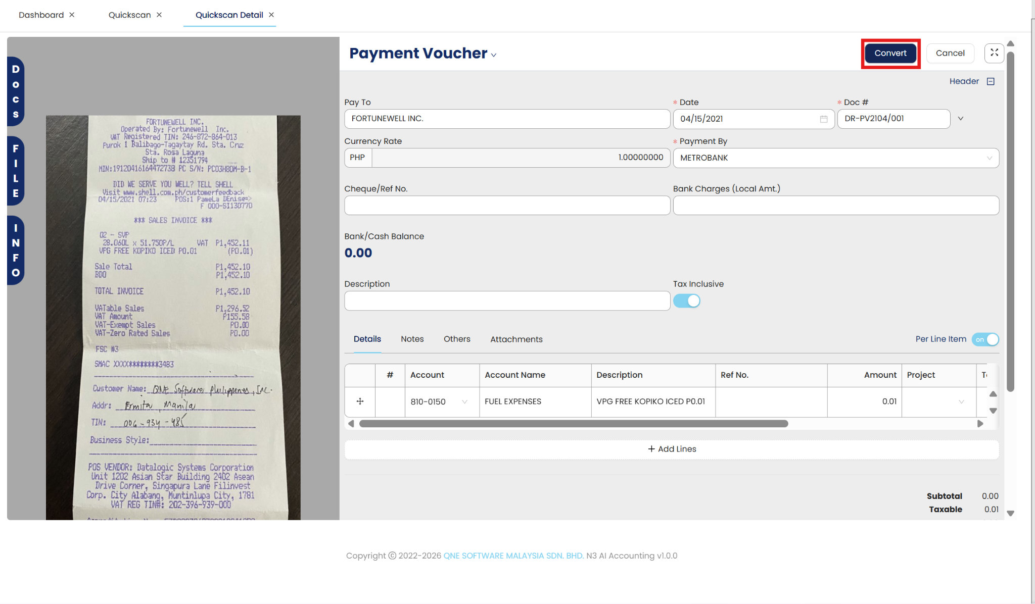 3. At the top part of the page, click Convert to convert the document into a transaction.