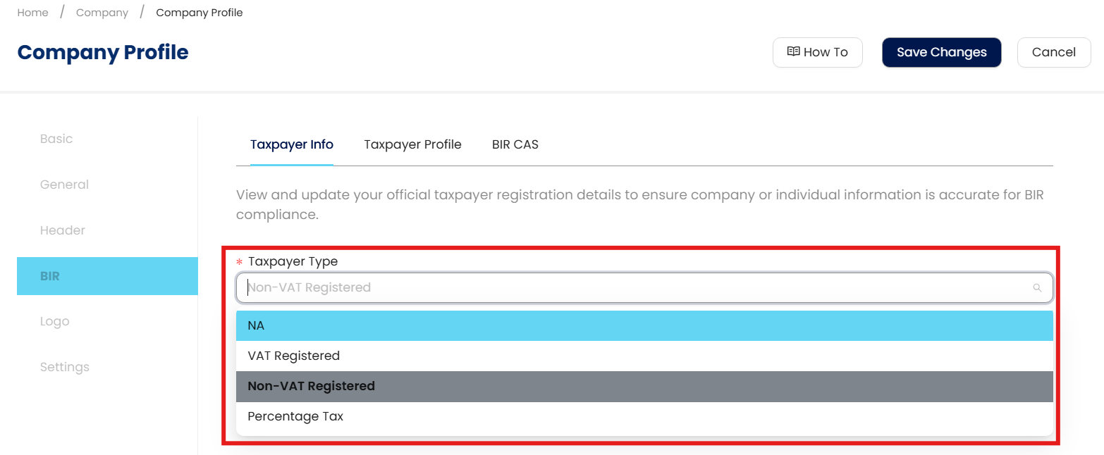 Taxpayer type is used to identify which type of taxpayer your company is, whether you are a non-VAT or VAT-registered entity. The selected type will be automatically added to the company header, which will then be displayed in the transaction and report preview formats