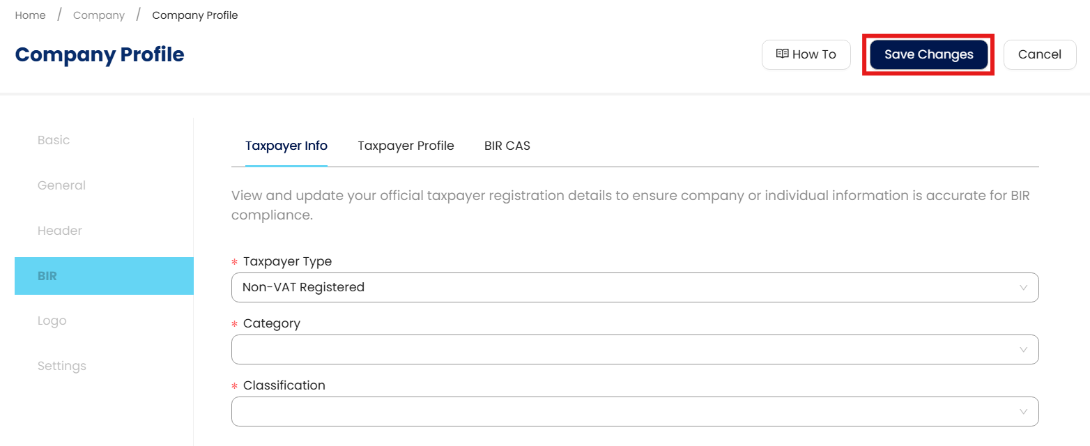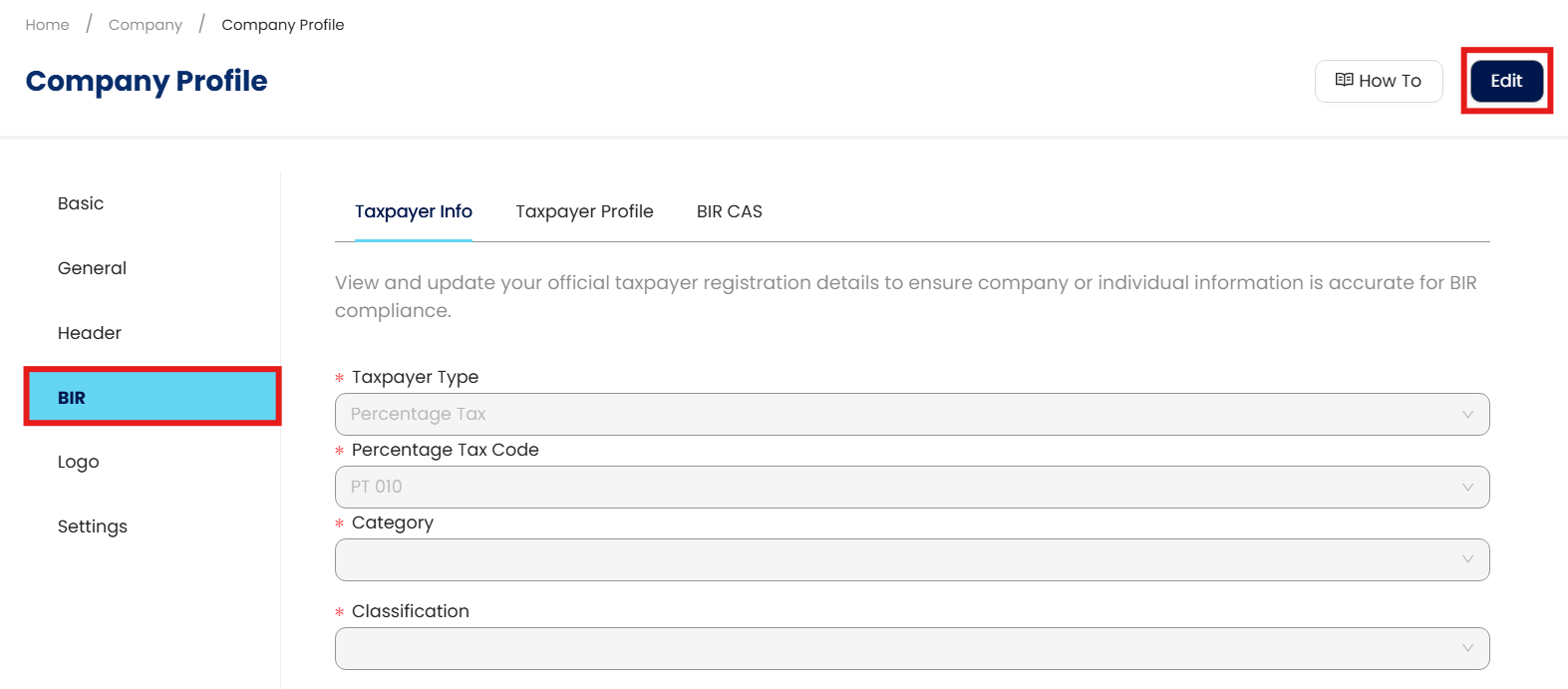 Note: If there are any changes to the company name, taxpayer type, TIN, branch code, address, telephone number, fax number, website, or email, the company header must be reset to apply the updated details. Refer to How to Reset Company Header.
