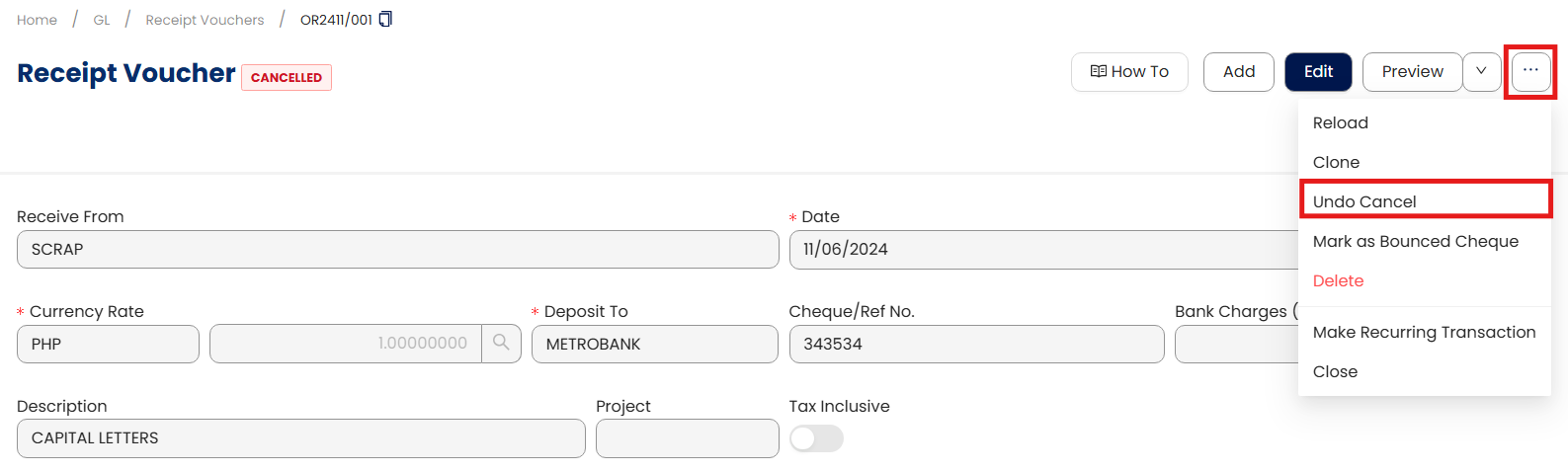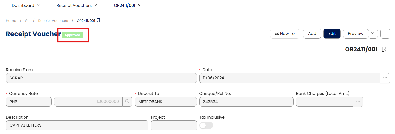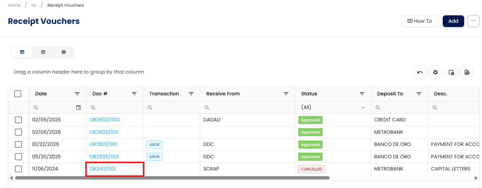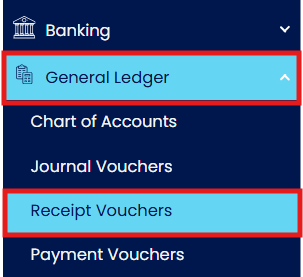 In Navigation Pane, go to General Ledger > Receipt Vouchers