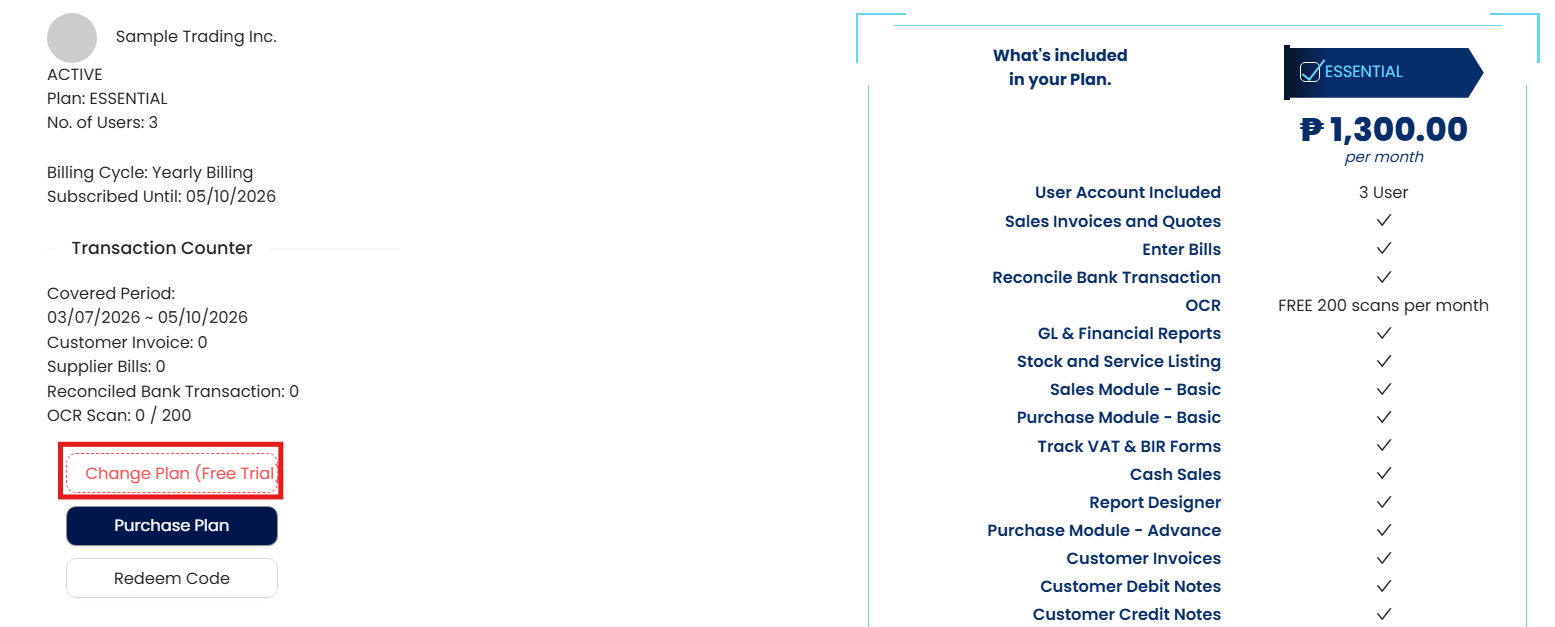 1. In My Subscription, click ‘Change Plan (Free Trial)’