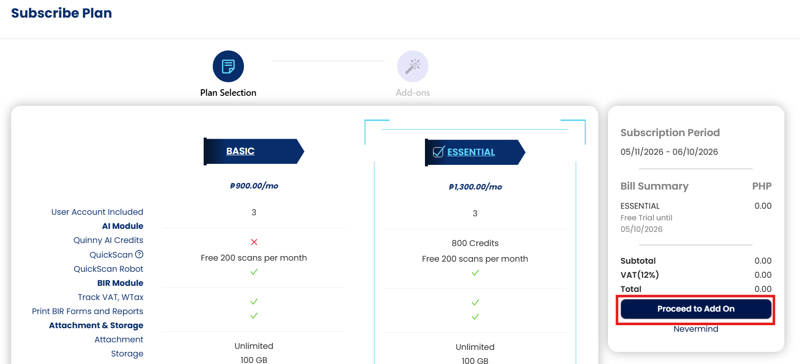 1. Change plan if applicable, click ‘Proceed to Add On’