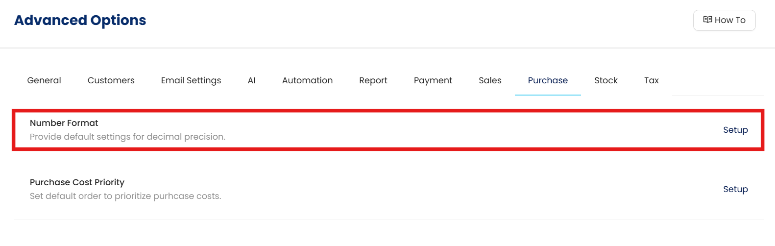2. In Advanced Options, go to the Purchase tab. Click ‘Setup’ in Number Format