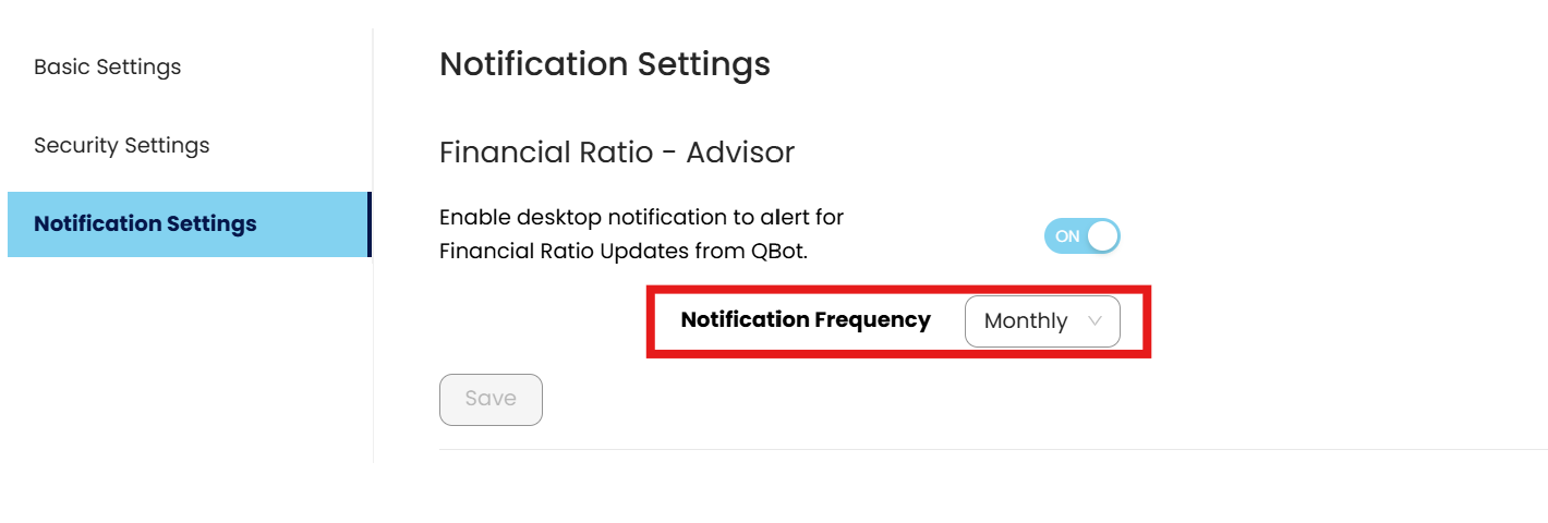 Click Notification Settings. By setting the toggle ON, desktop notification for the Financial Ratio updates will be displayed based on the Notification Frequency.