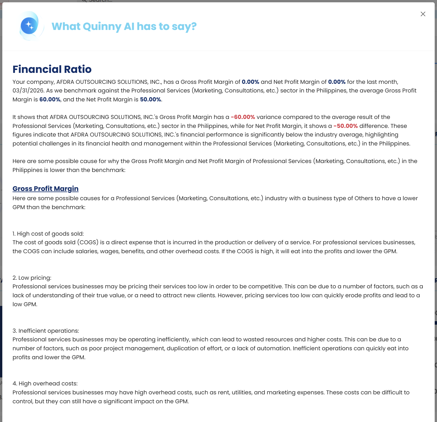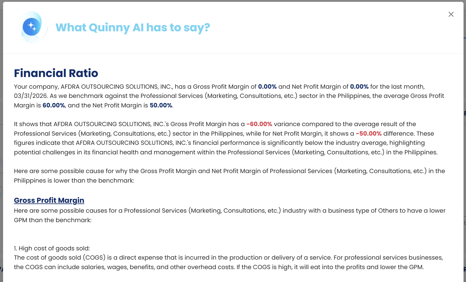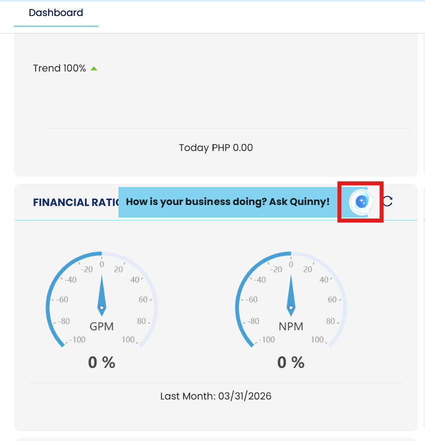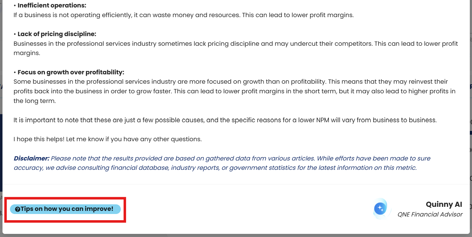 2. Under the Financial Ratio portion, click the Quinny AI icon. This will open the Financial Ratio Interpretation screen.
