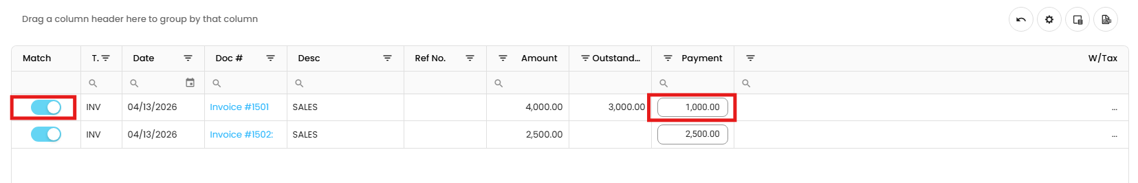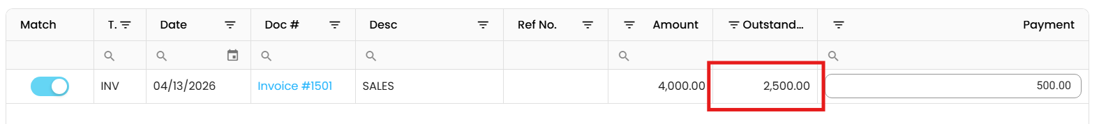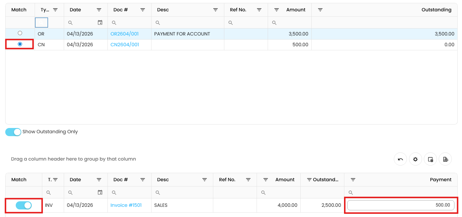 have been recorded.Select the payment you want to apply to the outstanding invoices.