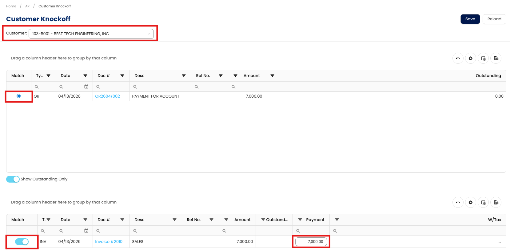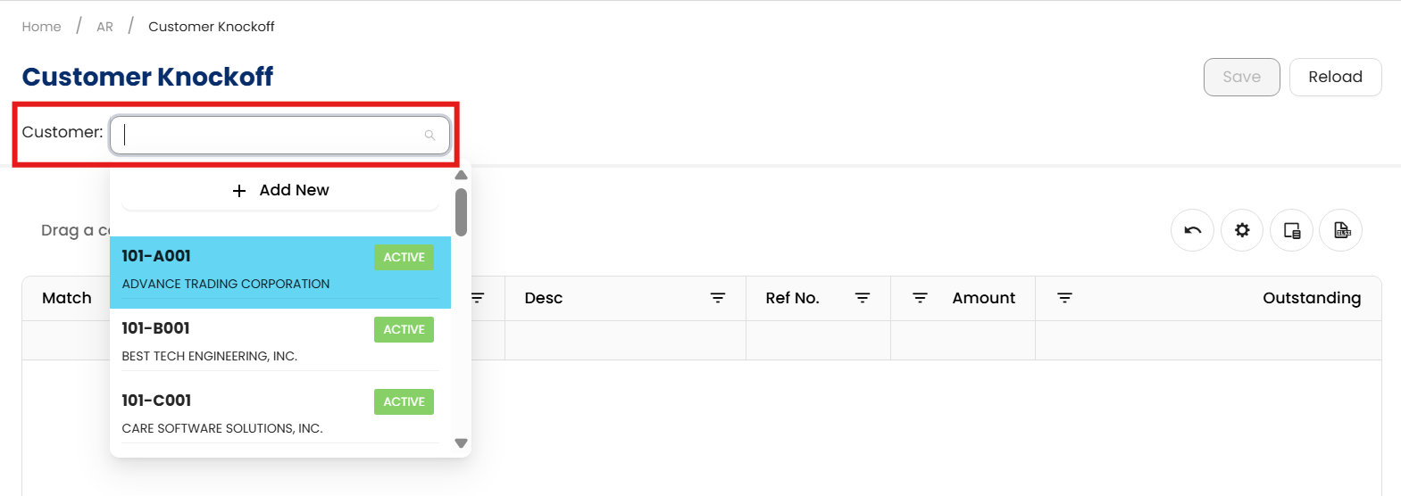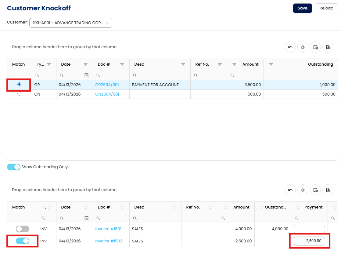 (e.g., ADVANCE TRADING CORPORATION).The system will display all open invoices, credit notes, and advance payments related to this