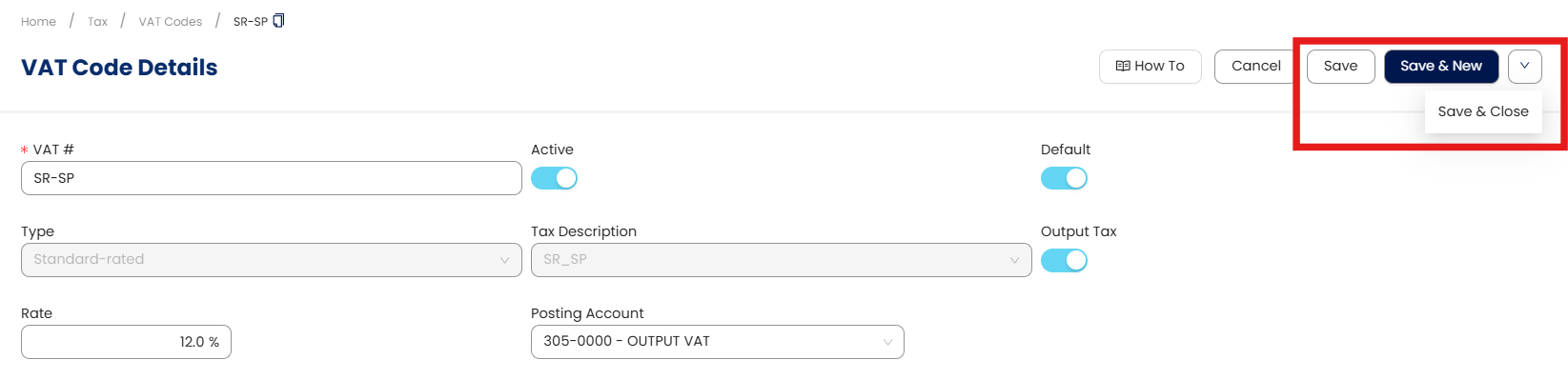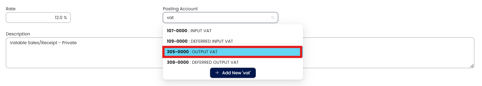 Click the Posting Account dropdown field and select the appropriate GL account corresponding to the VAT code.