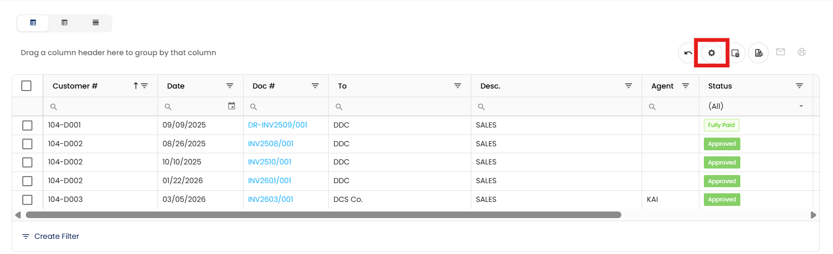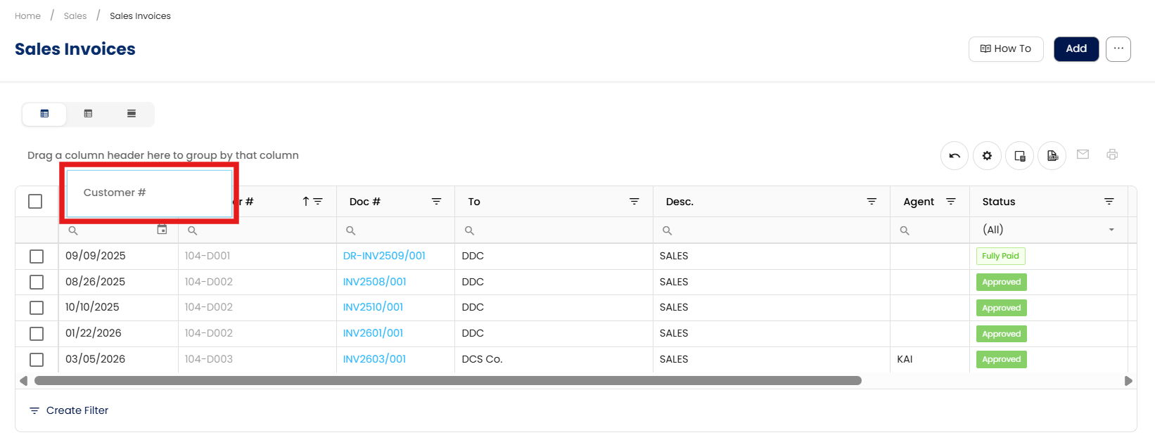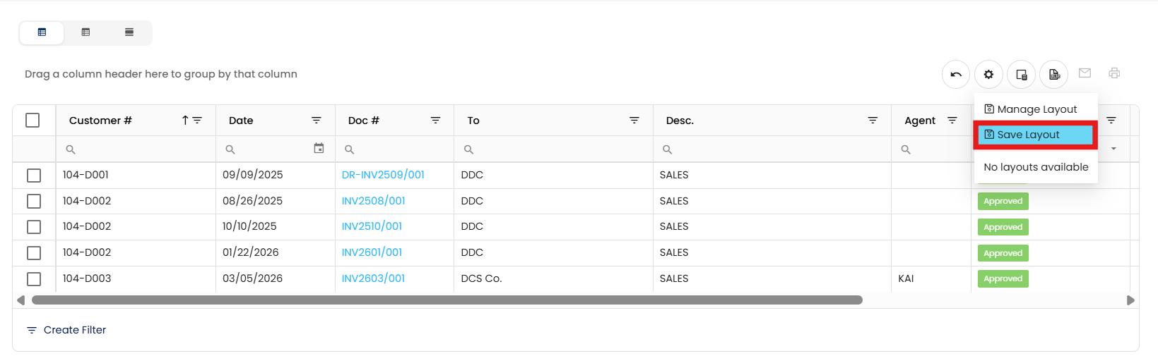 For example, the accounting team wants to monitor customer-specific billing. By grouping the Sales Invoice list view by Customer # and saving this as their default layout, they gain instant visibility on all invoices per customer, helping streamline collections and financial reviews.
