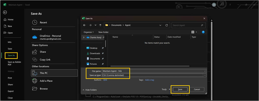 Save and open the Excel File. Navigate to File > Save As, then enter your chosen file name, and change the Save as type to CSV (Comma-delimited). Once you're finished, click Save.