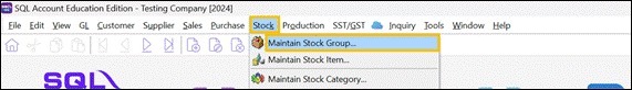 Access the Stock Group Maintenance Menu. Navigate to the Stock > Maintain Stock Group