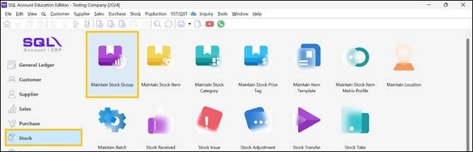 Alternatively, users may select Stock > Maintain Stock Group.