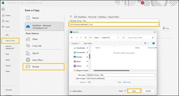 Click Save a Copy, change document type to CSV (Comma Delimited) (* .csv), then click Browse, choose desired document location, then Save once done.