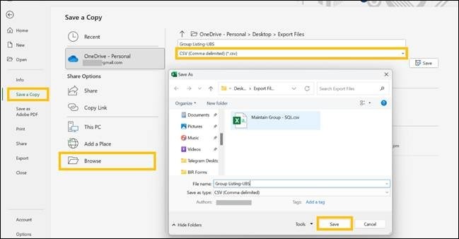 Since UBS doesn’t support CSV file, click Save a Copy, change document type to CSV (Comma Delimited) (* .csv), then click Browse, choose desired document location, then Save once done.