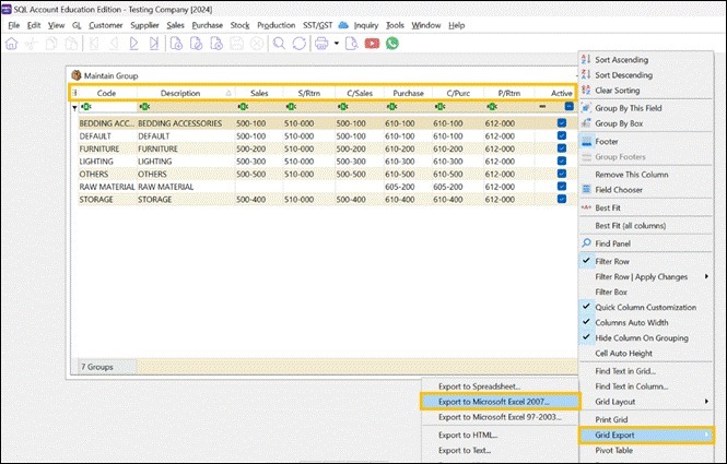 To export the file, right click on any Column Title > Grid Export > Export to Microsoft Excel