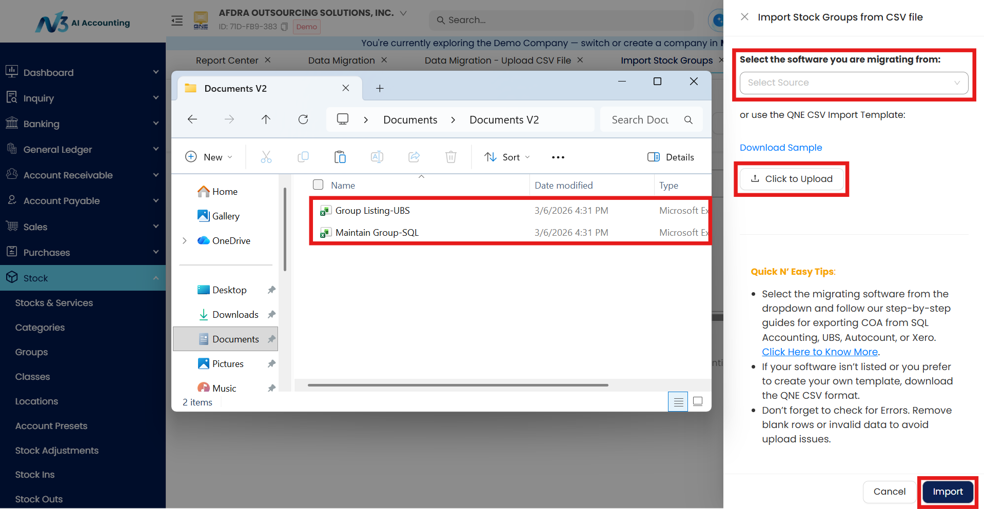 When migrating to N3 AI Accounting, one important step is bringing over your existing Stock Group classifications. These are used to categorize inventory items for better tracking, reporting, and analysis. Extracting this data from your previous accounting software ensures continuity and accuracy in your inventory setup.