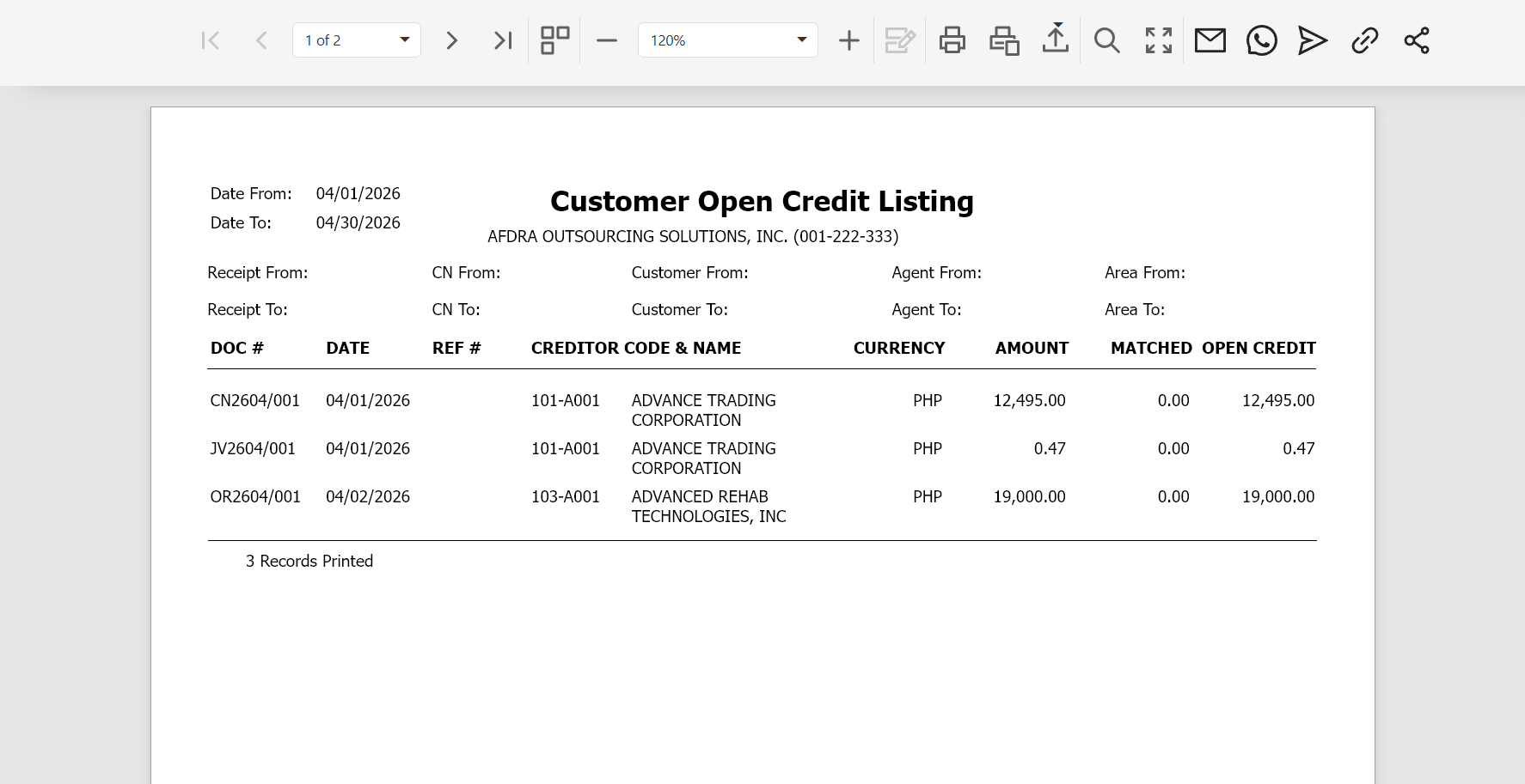 Maria, an accountant, notices that some customers have outstanding credits that were not applied to their recent invoices. To reconcile the accounts and prevent duplicate collections, she generates the Customer Open Credit Listing report in N3 AI Accounting . This allows her to see all unused credits per customer and apply them correctly.