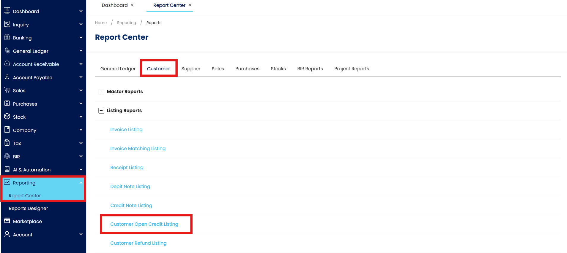 1. Navigate to Reporting > Report Center > Customer > Listing Reports