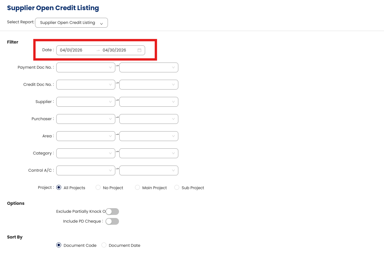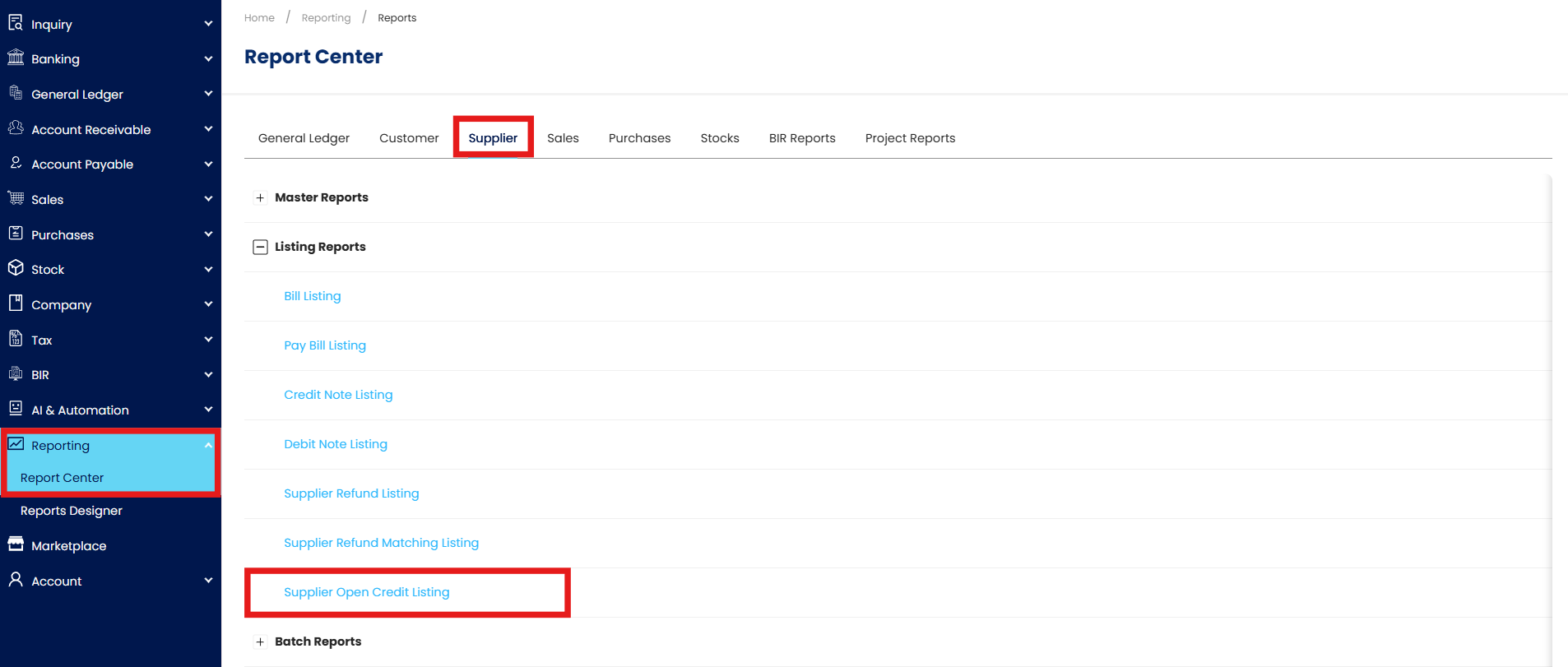 1. Navigate to Reporting > Report Center > Supplier > Listing Reports > Supplier Open Credit Listing.