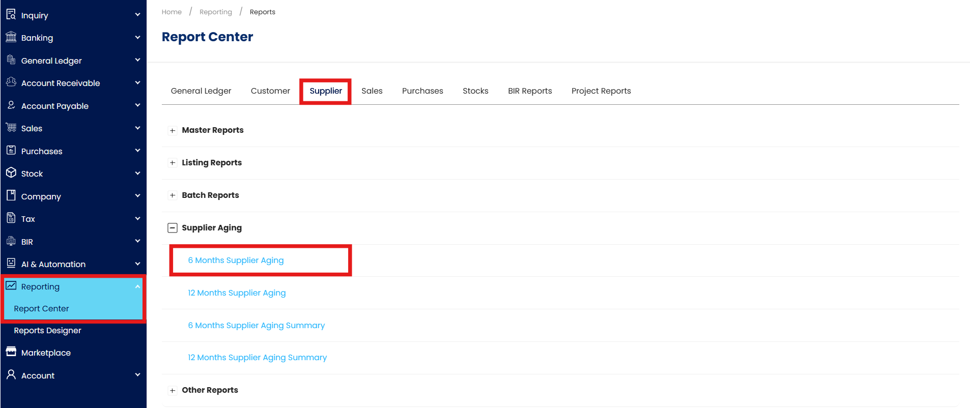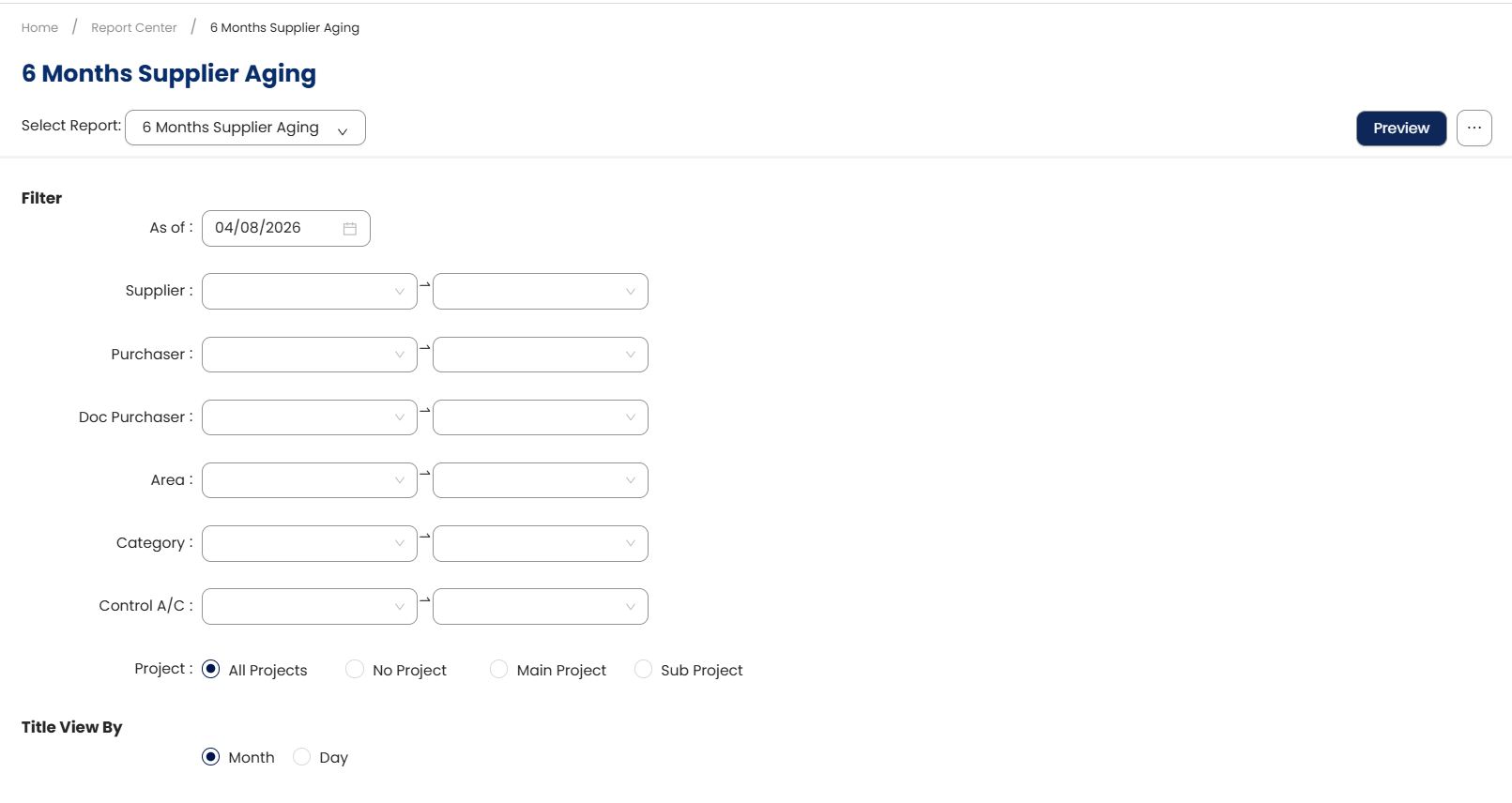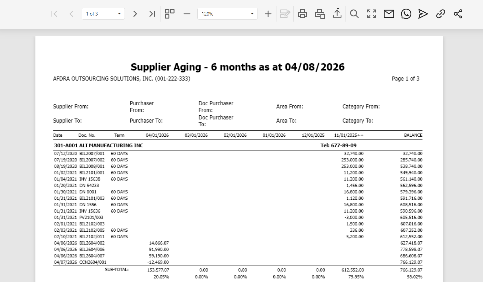 Leo, an accounts payable officer, needs to prepare a summary report for management to review supplier obligations over the past six months. By generating the 6-Months Supplier Aging Summary, Leo can quickly see which suppliers have the highest overdue balances and prepare a payment plan to avoid penalties and maintain good supplier credit standing.