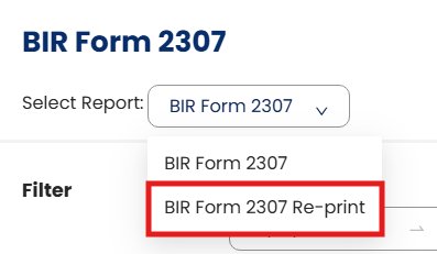 To generate a re-print copy, select BIR Form 2307 Re-print from the report drop-down list.