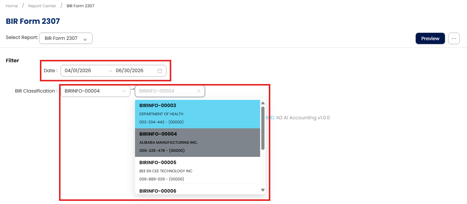 1. Click Preview to generate and display the BIR Form 2307 report.
