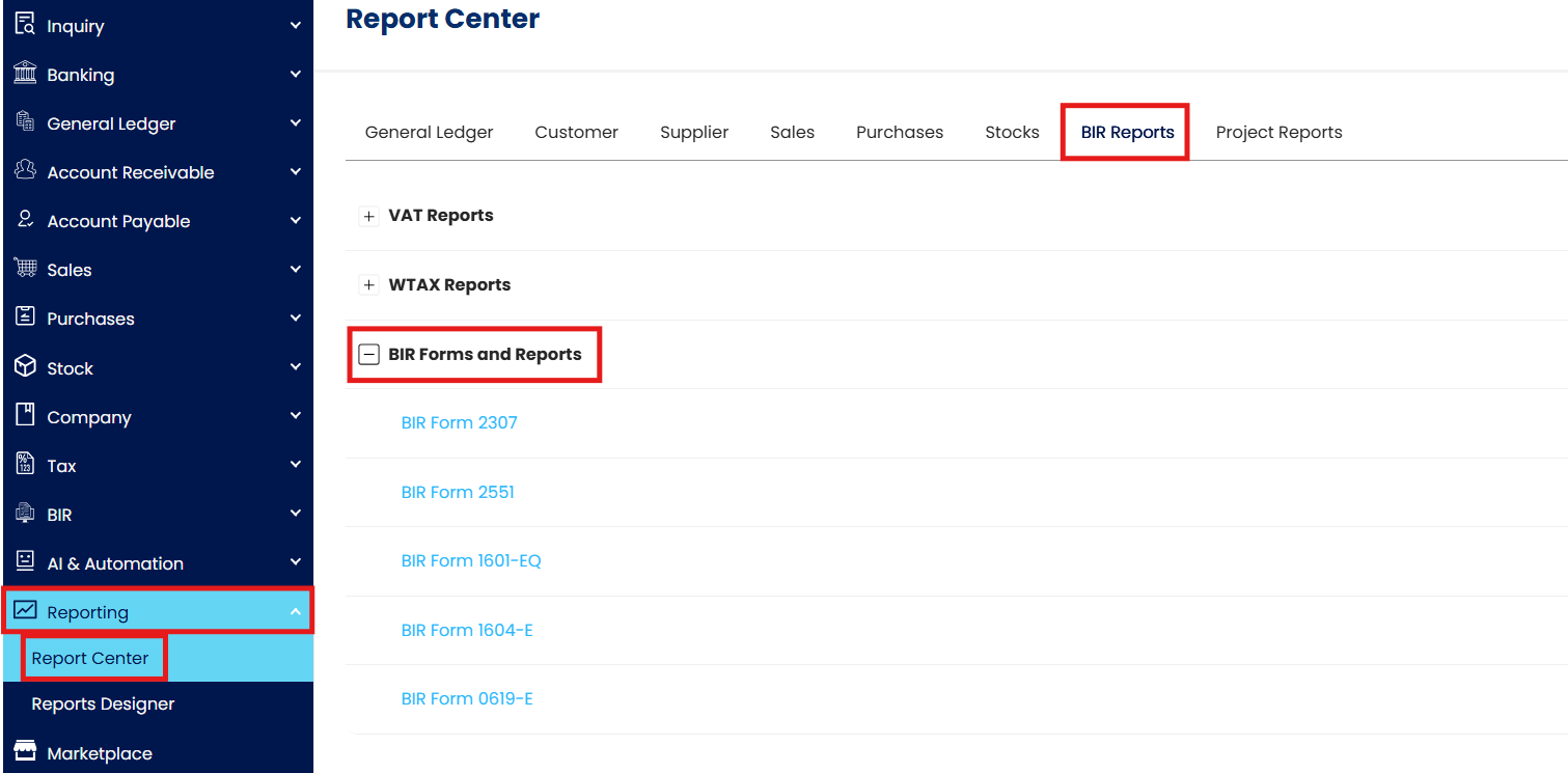 1. Go to Reporting > Report Center > BIR Reports > BIR Forms and Reports.