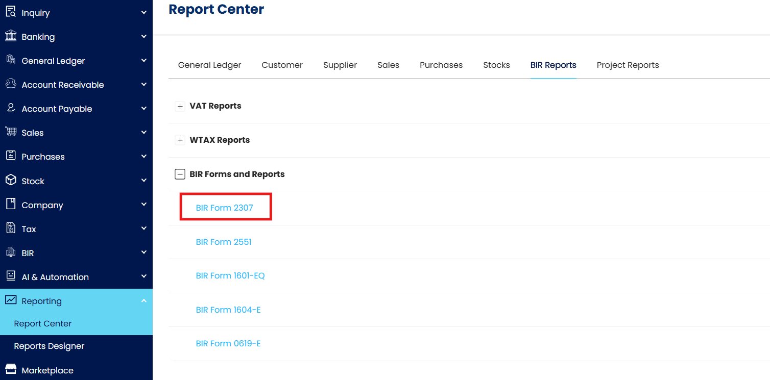 This feature allows you to generate BIR Form 2307 directly from the system using recorded transactions and withholding tax data.